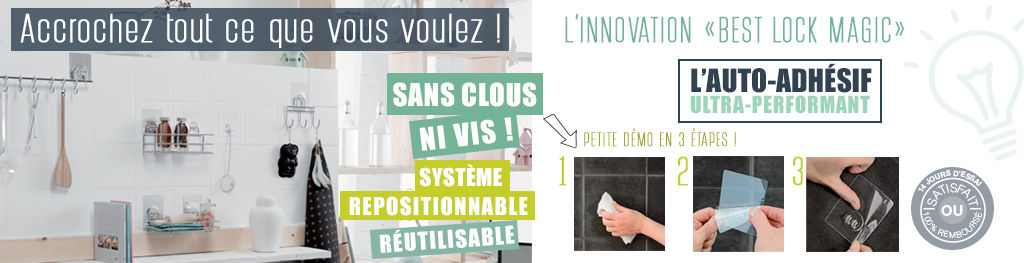 - Los ganchos Bestlock Magic se instalan con un giro de mano. Basta con hacer el vacío por presión y frotar el parche al muro, después enganchar cada módulo de ordenación en sus ultra-discretos parches.
