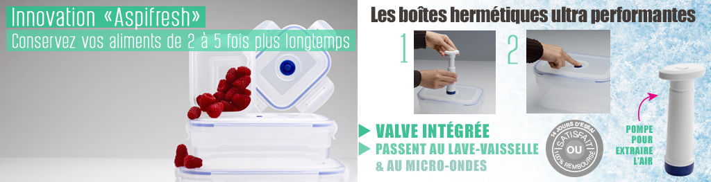 Por medio del innovador sistema de aspiración de aire, los envases Aspifresh se vacían de oxígeno evitando la oxidación de los alimentos y permitiendo un conservación más larga en el tiempo. Cada envase Aspifresh se entrega con una bomba de aspiración que permite hacer el vacío de aire